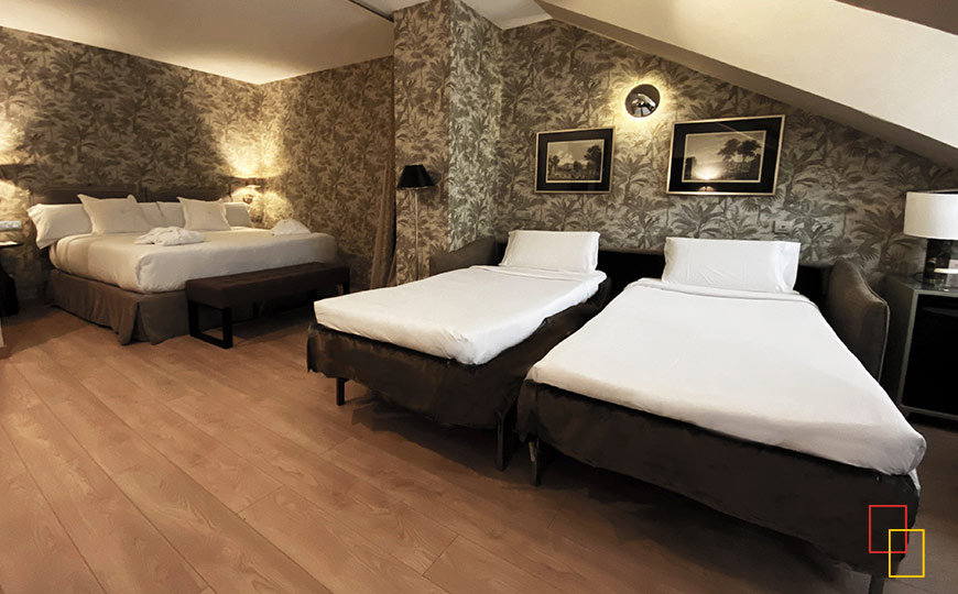 Habitación Cuádruple: Situadas en la última planta del edificio, ofrece un recibidor con un amplio vestidor y dos estancias diferenciadas, creando un ambiente hogareño con su techo abuhardillado. Diseñada para familias, permite que tanto niños como padres disfruten de su encanto mientras se encuentran en el corazón de la ciudad. La zona del dormitorio está equipada con una amplia cama King Size de 200 X 200 cms, TV y minibar.